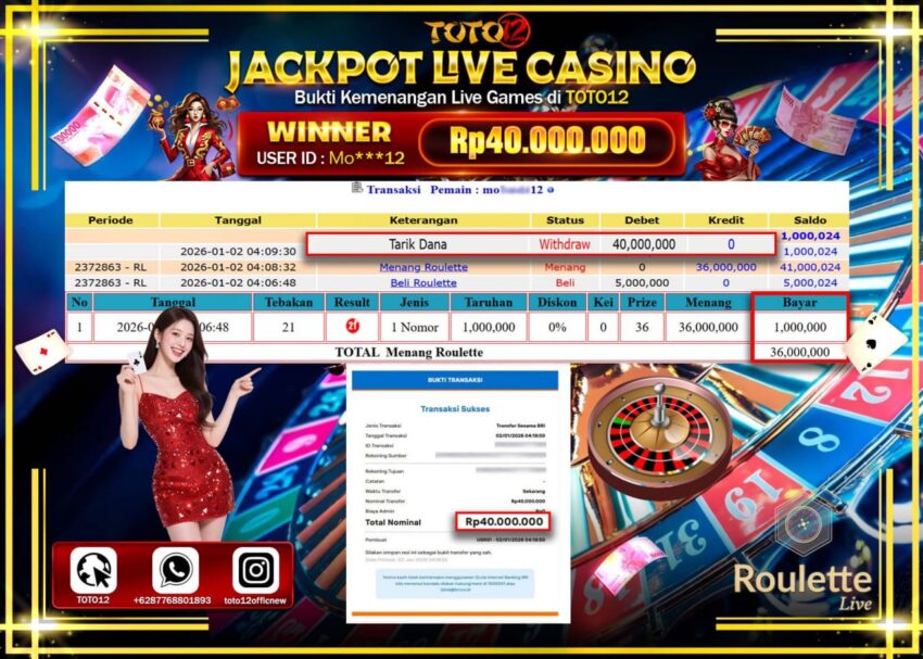 Selamat kepada Member Kami Mo****** Telah Jackpot dan berhasil mendapatkan kemenangan besar pada permainan JACKPOT LIVE CASINO (ROULETTE) Dengan Kemenangan Sebesar Rp.40.000.000 –.