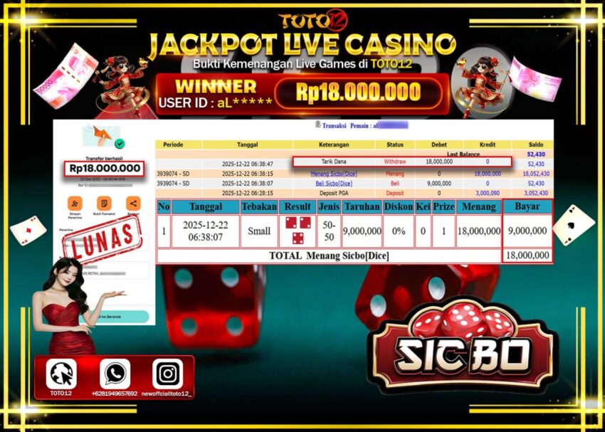 Selamat kepada Member Kami Al****** Telah Jackpot dan berhasil mendapatkan kemenangan besar pada permainan JACKPOT LIVE CASINO (SIC BO) Dengan Kemenangan Sebesar Rp.18.000.000 –.