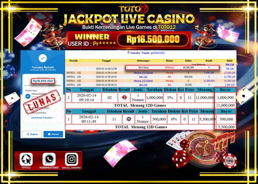 Selamat kepada Member Kami Pr***** Telah Jackpot dan berhasil mendapatkan kemenangan besar pada permainan JACKPOT LIVE GAME CASINO (12D) Dengan Kemenangan Sebesar Rp.16.500.000–. Setelah mengisi Fomulir Withdraw dengan Kurang waktu 1-2 Menit Dana sudah kami Trasnfer kepada Pemilik Userid dan dana sudah dapat di cairkan oleh pemenang. Bukti Pembayaran yang TOTO12 berikan merupakan Bukti Pembayaran yang SAH / VALID yang langsung Di dapatkan melalui transaksi dari Bank yang di Tunju.