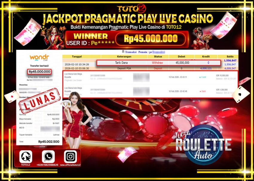 Selamat kepada Member Kami Pe***** Telah Jackpot dan berhasil mendapatkan kemenangan besar pada permainan JACKPOT LIVE GAME CASINO (LIVE MANIA Auto Mega Roulette)  Dengan Kemenangan Sebesar Rp.45.000.000–.  Setelah mengisi Fomulir Withdraw dengan Kurang waktu 1-2 Menit Dana sudah kami Trasnfer kepada Pemilik Userid dan dana sudah dapat di cairkan oleh pemenang. Bukti Pembayaran yang TOTO12 berikan merupakan Bukti Pembayaran yang  SAH / VALID yang langsung Di dapatkan melalui transaksi dari Bank yang di Tunju.