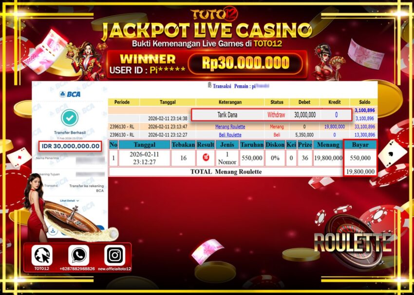 Selamat kepada Member Kami Pi***** Telah Jackpot dan berhasil mendapatkan kemenangan besar pada permainan JACKPOT LIVE GAME CASINO (ROULETTE)  Dengan Kemenangan Sebesar Rp.30.000.000–.  Setelah mengisi Fomulir Withdraw dengan Kurang waktu 1-2 Menit Dana sudah kami Trasnfer kepada Pemilik Userid dan dana sudah dapat di cairkan oleh pemenang. Bukti Pembayaran yang TOTO12 berikan merupakan Bukti Pembayaran yang  SAH / VALID yang langsung Di dapatkan melalui transaksi dari Bank yang di Tunju.