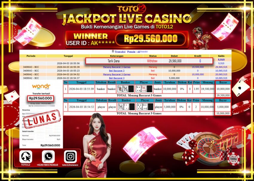 Selamat kepada Member Kami AK**** Telah Jackpot dan berhasil mendapatkan kemenangan besar pada permainan JACKPOT LIVE GAMES CASINO (BACCARAT 3) Dengan Kemenangan Sebesar Rp.29.560.000–.