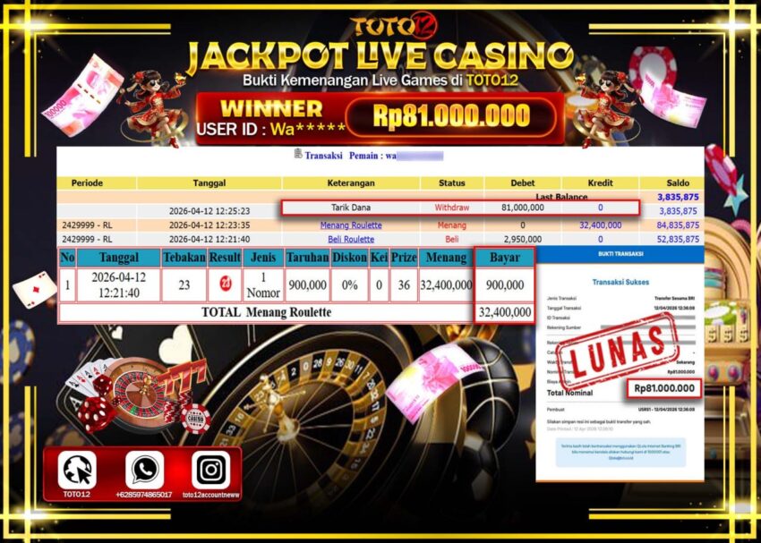 Selamat kepada Member Kami Wa**** Telah Jackpot dan berhasil mendapatkan kemenangan besar pada permainan JACKPOT LIVE GAMES CASINO (ROULETTE) Dengan Kemenangan Sebesar Rp.81.000.000–.