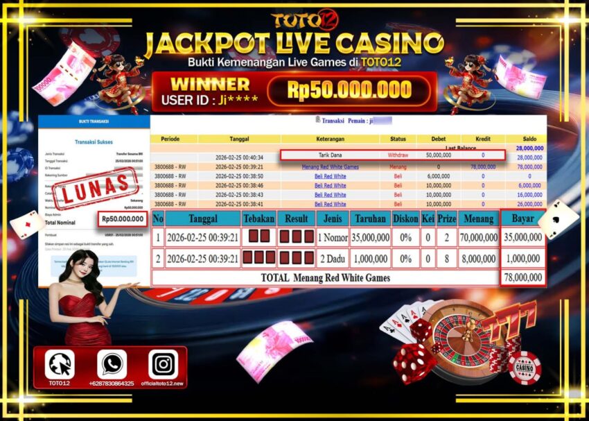 HANYA DI TOTO12 JP PASTI DI BAYAR LUNAS DAN CEPAT!!!!!! JACKPOT LIVE GAMES CASINO(RED WHITE) Rp.50.000.000!!!!