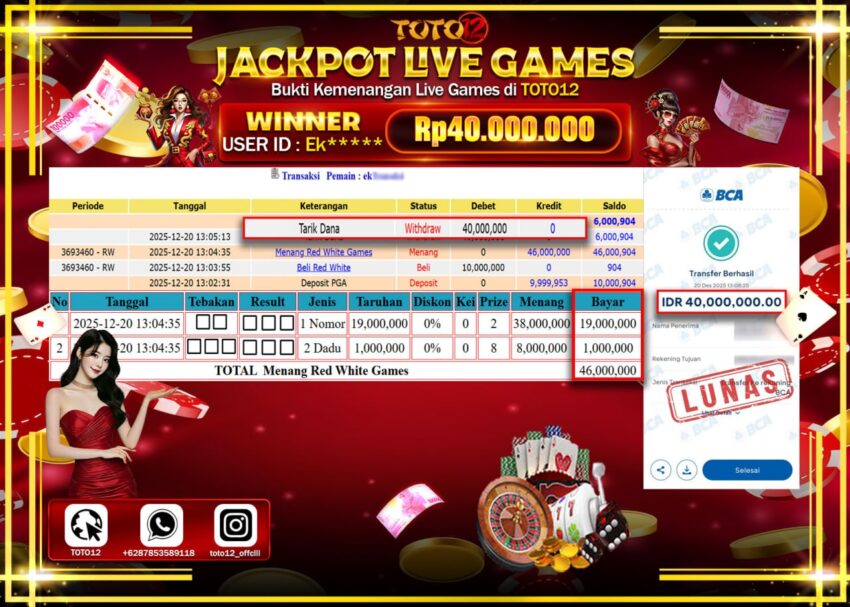 Selamat kepada Member Kami Ek****** Telah Jackpot dan berhasil mendapatkan kemenangan besar pada permainan JACKPOT LIVE GAMES (RED WHITE) Dengan Kemenangan Sebesar Rp.40.000.000 –.
