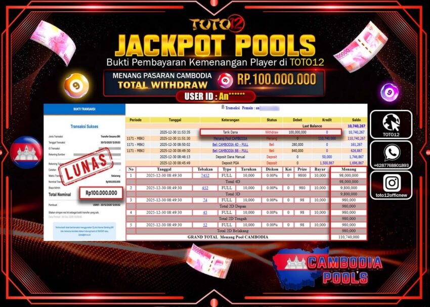 Selamat kepada Member Kami An****** Telah Jackpot dan berhasil mendapatkan kemenangan besar pada permainan JACKPOT POOLS PASARAN (CAMBODIA) Dengan Kemenangan Sebesar Rp.100.000.000 –.