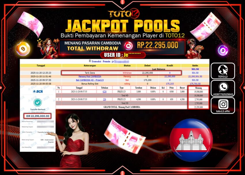 Selamat kepada Member Kami Je****** Telah Jackpot dan berhasil mendapatkan kemenangan besar pada permainan JACKPOT POOLS PASARAN (CAMBODIA)  Dengan Kemenangan Sebesar Rp.22.295.000 –.  Setelah mengisi Fomulir Withdraw dengan Kurang waktu 1-2 Menit Dana sudah kami Trasnfer kepada Pemilik Userid dan dana sudah dapat di cairkan oleh pemenang. Bukti Pembayaran yang TOTO12 berikan merupakan Bukti Pembayaran yang  SAH / VALID yang langsung Di dapatkan melalui transaksi dari Bank yang di Tunju.