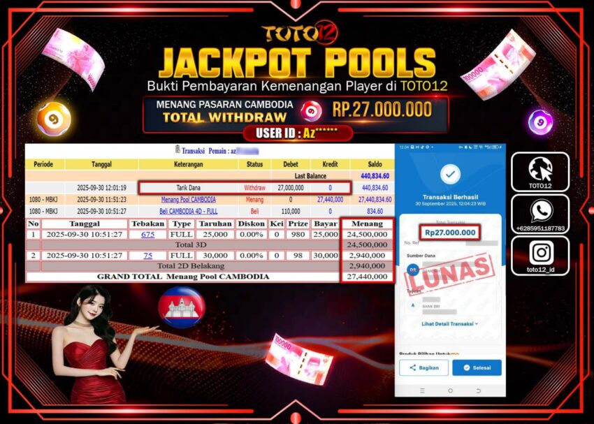 Selamat kepada Member Kami Az****** Telah Jackpot dan berhasil mendapatkan kemenangan besar pada permainan JACKPOT POOLS PASARAN (CAMBODIA)  Dengan Kemenangan Sebesar Rp.27.000.000 –.  Setelah mengisi Fomulir Withdraw dengan Kurang waktu 1-2 Menit Dana sudah kami Trasnfer kepada Pemilik Userid dan dana sudah dapat di cairkan oleh pemenang. Bukti Pembayaran yang TOTO12 berikan merupakan Bukti Pembayaran yang  SAH / VALID yang langsung Di dapatkan melalui transaksi dari Bank yang di Tunju.