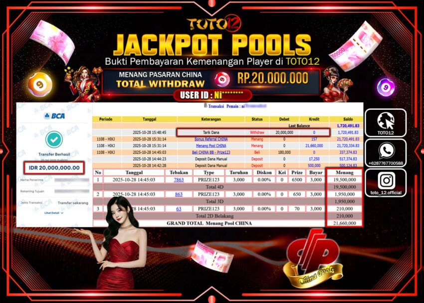 Selamat kepada Member Kami Ni****** Telah Jackpot dan berhasil mendapatkan kemenangan besar pada permainan JACKPOT POOLS PASARAN (CHINA) Dengan Kemenangan Sebesar Rp.20.000.000 –. Setelah mengisi Fomulir Withdraw dengan Kurang waktu 1-2 Menit Dana sudah kami Trasnfer kepada Pemilik Userid dan dana sudah dapat di cairkan oleh pemenang. Bukti Pembayaran yang TOTO12 berikan merupakan Bukti Pembayaran yang SAH / VALID yang langsung Di dapatkan melalui transaksi dari Bank yang di Tunju.