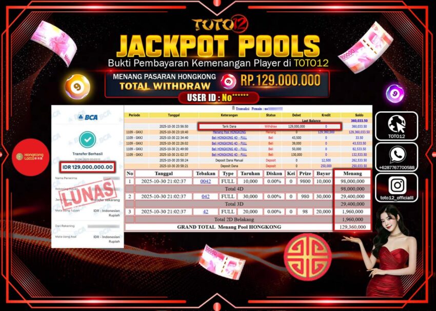Selamat kepada Member Kami No****** Telah Jackpot dan berhasil mendapatkan kemenangan besar pada permainan JACKPOT POOLS PASARAN (HONGKONG) Dengan Kemenangan Sebesar Rp.129.000.000 –. Setelah mengisi Fomulir Withdraw dengan Kurang waktu 1-2 Menit Dana sudah kami Trasnfer kepada Pemilik Userid dan dana sudah dapat di cairkan oleh pemenang. Bukti Pembayaran yang TOTO12 berikan merupakan Bukti Pembayaran yang SAH / VALID yang langsung Di dapatkan melalui transaksi dari Bank yang di Tunju.