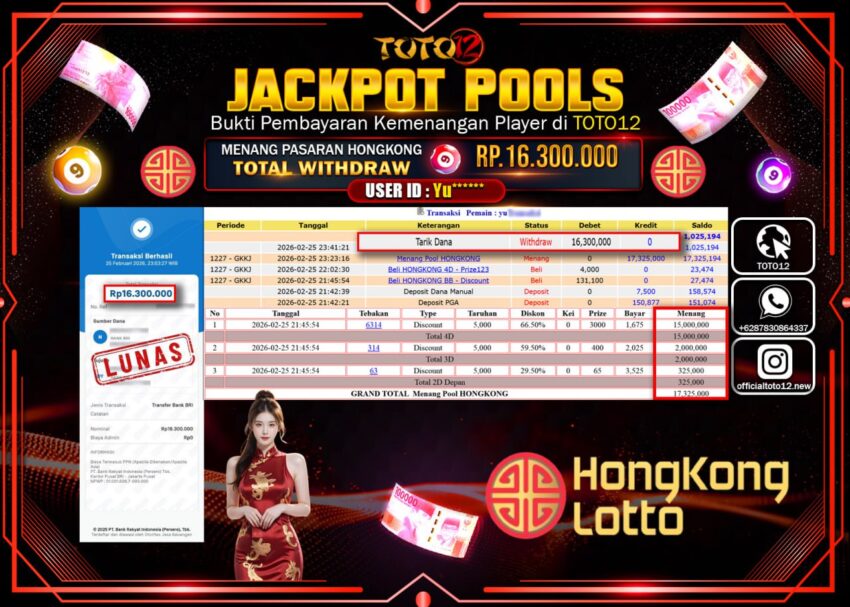 Selamat kepada Member Kami Yu****** Telah Jackpot dan berhasil mendapatkan kemenangan besar pada permainan JACKPOT POOLS PASARAN  (HONGKONG)  Dengan Kemenangan Sebesar Rp.16.300.000–.
