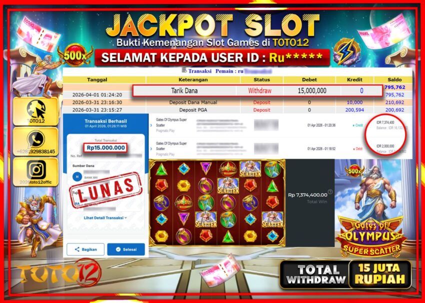 Selamat kepada Member Kami Ru***** Telah Jackpot dan berhasil mendapatkan kemenangan besar pada permainan JACKPOT SLOT GAME (GATES OF OLYMPUS SUPER SCATTER) Dengan Kemenangan Sebesar Rp.15.000.000–.
