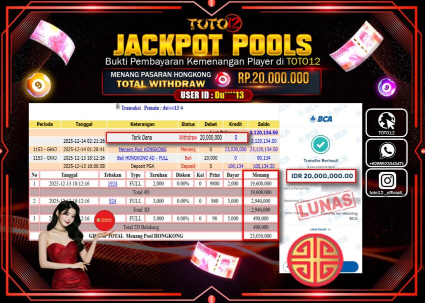 Selamat kepada Member Kami Du****** Telah Jackpot dan berhasil mendapatkan kemenangan besar pada permainan JACKPOT POOLS PASARAN (HONGKONG)  Dengan Kemenangan Sebesar Rp.20.000.000 –.