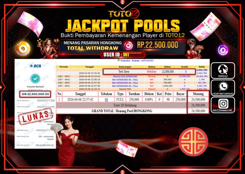Selamat kepada Member Kami Wi****** Telah Jackpot dan berhasil mendapatkan kemenangan besar pada permainan JACKPOT POOLS PASARAN ( HONGKONG ) Dengan Kemenangan Sebesar Rp.22.500.000–.