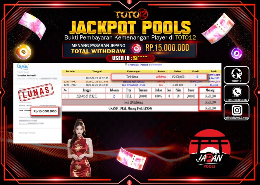Selamat kepada Member Kami Si****** Telah Jackpot dan berhasil mendapatkan kemenangan besar pada permainan JACKPOT POOLS PASARAN (JEPANG) Dengan Kemenangan Sebesar Rp.15.000.000–.