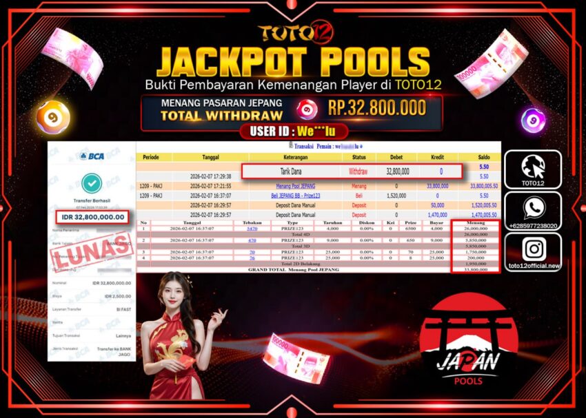 Selamat kepada Member Kami We***luTelah Jackpot dan berhasil mendapatkan kemenangan besar pada permainan JACKPOT POOLS PASARAN (JEPANG) Dengan Kemenangan Sebesar Rp.32.800.000–.