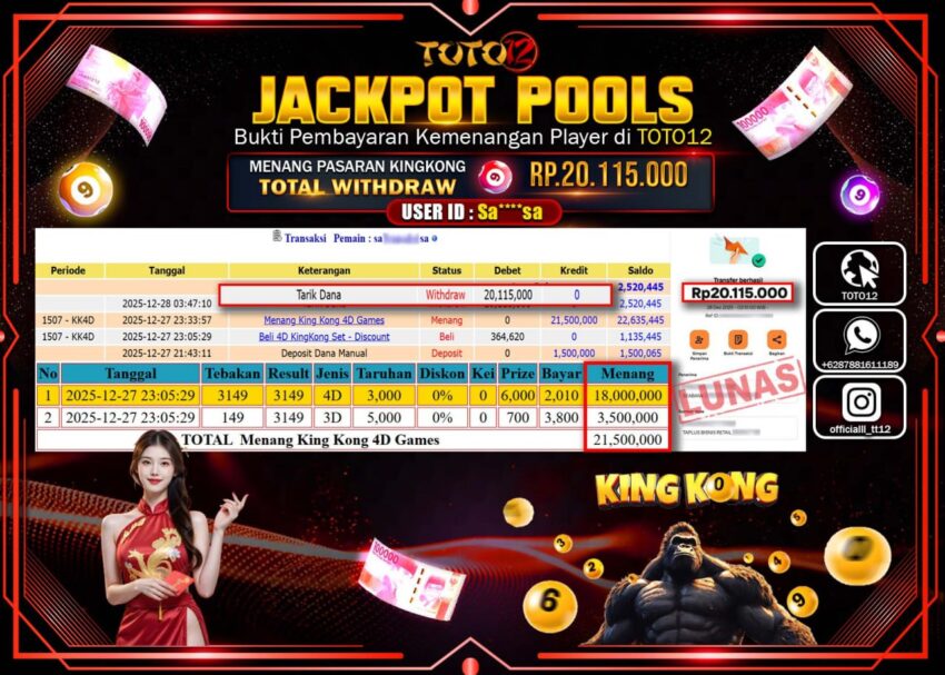 HANYA DI TOTO12 JP PASTI DI BAYAR LUNAS DAN CEPAT!!!!!! JACKPOT POOLS PASARAN (KING KONG 4D) Rp.20.115.000 !!!!