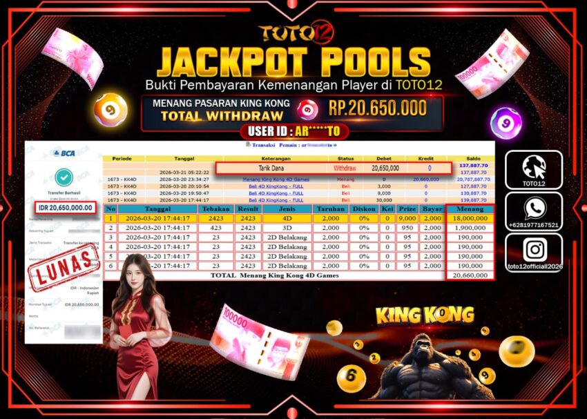 Selamat kepada Member Kami AR*****TO Telah Jackpot dan berhasil mendapatkan kemenangan besar pada permainan JACKPOT POOLS PASARAN (KINGKONG 4D) Dengan Kemenangan Sebesar Rp.20.650.000–.