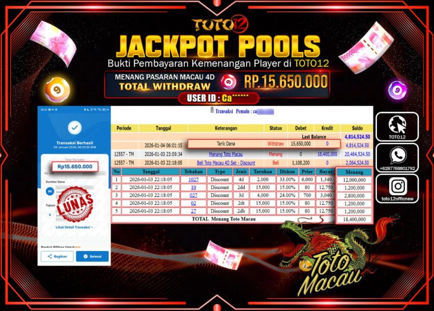 HANYA DI TOTO12 JP PASTI DI BAYAR LUNAS DAN CEPAT!!!!!! JACKPOT POOLS PASARAN (MACAU 4D) Rp.15.650.000 !!!!