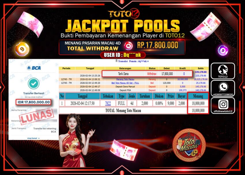 HANYA DI TOTO12 JP PASTI DI BAYAR LUNAS DAN CEPAT!!!!!! JACKPOT POOLS PASARAN (MACAU 4D) Rp.17.800.000 !!!!