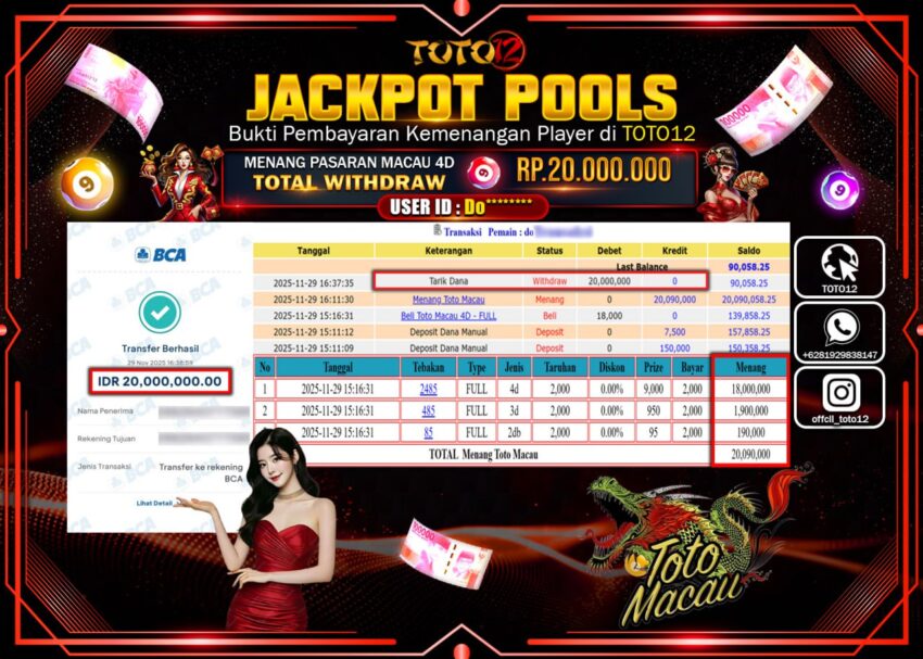 Selamat kepada Member Kami Do****** Telah Jackpot dan berhasil mendapatkan kemenangan besar pada permainan JACKPOT POOLS PASARAN (MACAU 4D)  Dengan Kemenangan Sebesar Rp.20.000.000 –.