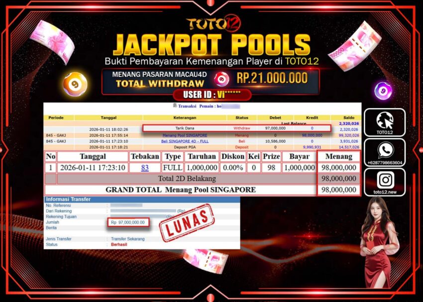 • HANYA DI TOTO12 JP PASTI DI BAYAR LUNAS DAN CEPAT!!!!!! JACKPOT POOLS PASARAN (SINGAPORE) Rp.16.000.000 !!!!