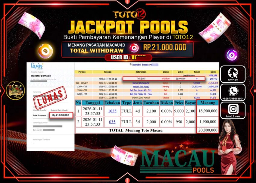Selamat kepada Member Kami Vi****** Telah Jackpot dan berhasil mendapatkan kemenangan besar pada permainan JACKPOT POOLS PASARAN (MACAU 4D) Dengan Kemenangan Sebesar Rp.21.000.000 –.
