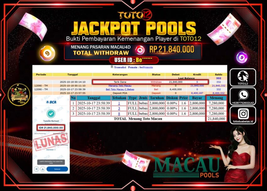Selamat kepada Member Kami Bo****** Telah Jackpot dan berhasil mendapatkan kemenangan besar pada permainan JACKPOT POOLS PASARAN (MACAU 4D) Dengan Kemenangan Sebesar Rp.21.840.000 –. Setelah mengisi Fomulir Withdraw dengan Kurang waktu 1-2 Menit Dana sudah kami Trasnfer kepada Pemilik Userid dan dana sudah dapat di cairkan oleh pemenang. Bukti Pembayaran yang TOTO12 berikan merupakan Bukti Pembayaran yang SAH / VALID yang langsung Di dapatkan melalui transaksi dari Bank yang di Tunju.