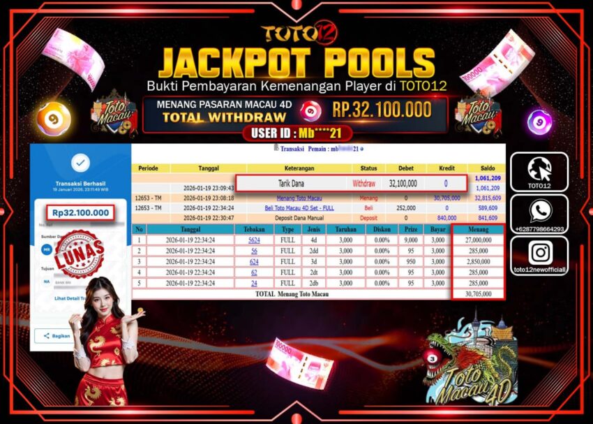 HANYA DI TOTO12 JP PASTI DI BAYAR LUNAS DAN CEPAT!!!!!! JACKPOT POOLS PASARAN (MACAU 4D) Rp.32.100.000 !!!!