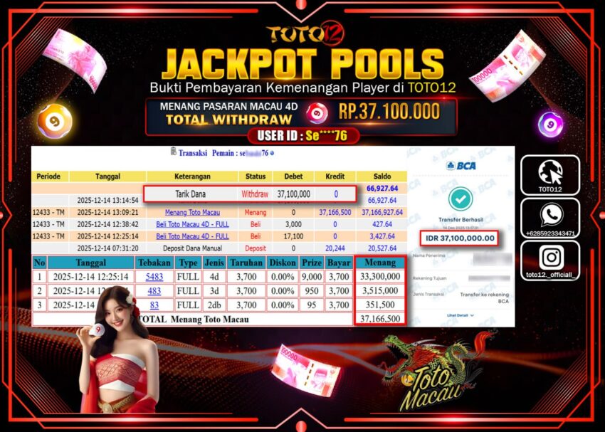 HANYA DI TOTO12 JP PASTI DI BAYAR LUNAS DAN CEPAT!!!!!! JACKPOT POOLS PASARAN (MACAU 4D) Rp.37.100.000 !!!!