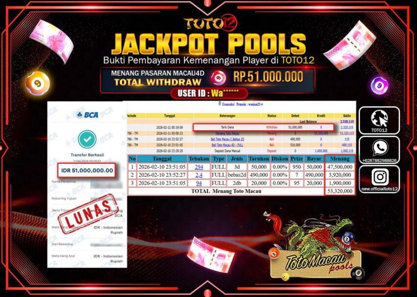 Selamat kepada Member Kami Wa***** Telah Jackpot dan berhasil mendapatkan kemenangan besar pada permainan JACKPOT POOLS PASARAN (MACAU 4D) Dengan Kemenangan Sebesar Rp.51.000.000–.
