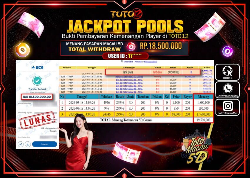 Selamat kepada Member Kami Ti***** Telah Jackpot dan berhasil mendapatkan kemenangan besar pada permainan JACKPOT POOLS PASARAN (MACAU 5D) Dengan Kemenangan Sebesar Rp.18.500.000–.