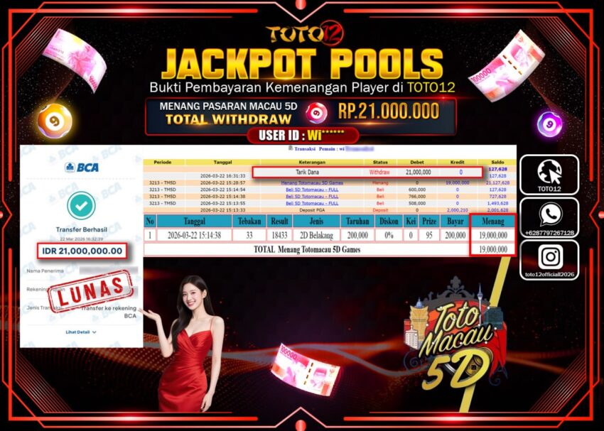 Selamat kepada Member Kami Wi***** Telah Jackpot dan berhasil mendapatkan kemenangan besar pada permainan JACKPOT POOLS PASARAN (MACAU 5D) Dengan Kemenangan Sebesar Rp.21.000.000–.