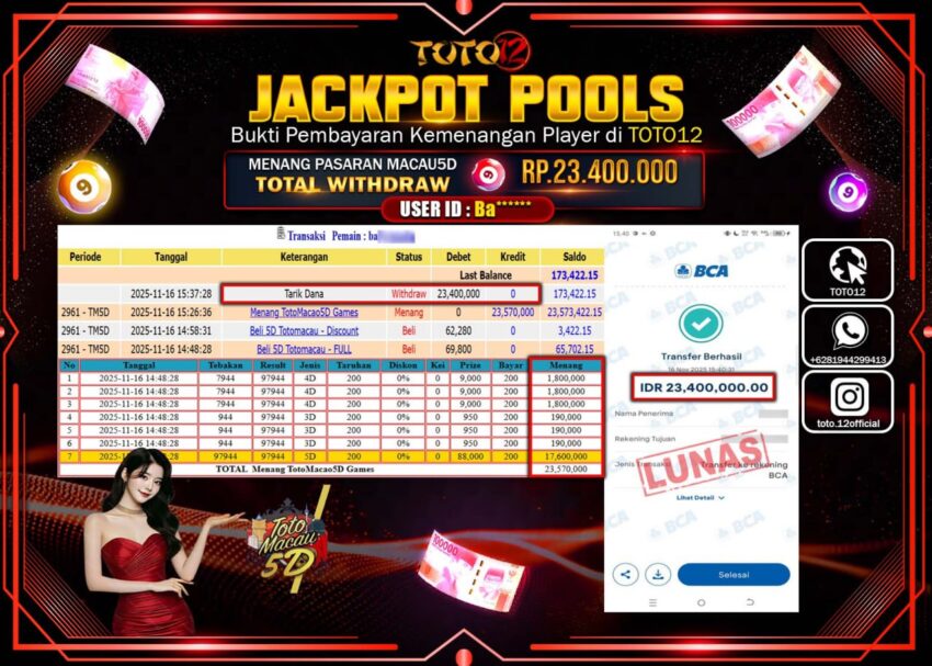 Selamat kepada Member Kami Ba****** Telah Jackpot dan berhasil mendapatkan kemenangan besar pada permainan JACKPOT POOLS PASARAN (MACAU 5D) Dengan Kemenangan Sebesar Rp.23.400.000 –. Setelah mengisi Fomulir Withdraw dengan Kurang waktu 1-2 Menit Dana sudah kami Trasnfer kepada Pemilik Userid dan dana sudah dapat di cairkan oleh pemenang. Bukti Pembayaran yang TOTO12 berikan merupakan Bukti Pembayaran yang SAH / VALID yang langsung Di dapatkan melalui transaksi dari Bank yang di Tunju.