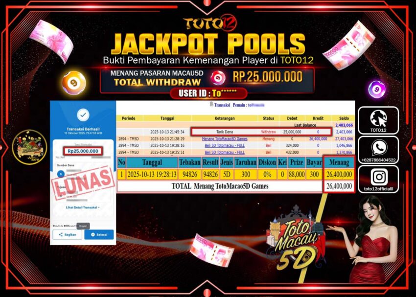 Selamat kepada Member Kami To****** Telah Jackpot dan berhasil mendapatkan kemenangan besar pada permainan JACKPOT POOLS PASARAN (MACAU 5D) Dengan Kemenangan Sebesar Rp.25.000.000 –. Setelah mengisi Fomulir Withdraw dengan Kurang waktu 1-2 Menit Dana sudah kami Trasnfer kepada Pemilik Userid dan dana sudah dapat di cairkan oleh pemenang. Bukti Pembayaran yang TOTO12 berikan merupakan Bukti Pembayaran yang SAH / VALID yang langsung Di dapatkan melalui transaksi dari Bank yang di Tunju.
