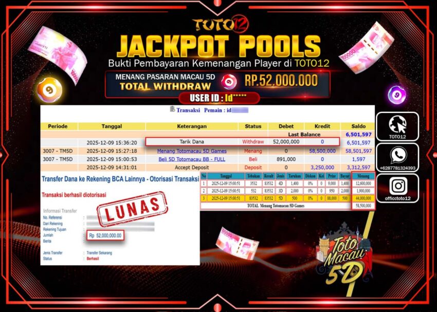 HANYA DI TOTO12 JP PASTI DI BAYAR LUNAS DAN CEPAT!!!!!! JACKPOT POOLS PASARAN (MACAU 5D) Rp.52.000.000 !!!!