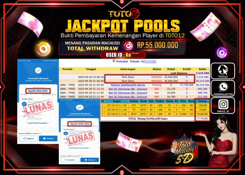 Selamat kepada Member Kami Ke****** Telah Jackpot dan berhasil mendapatkan kemenangan besar pada permainan JACKPOT POOLS PASARAN (MACAU 5D)  Dengan Kemenangan Sebesar Rp.55.000.000 –.  Setelah mengisi Fomulir Withdraw dengan Kurang waktu 1-2 Menit Dana sudah kami Trasnfer kepada Pemilik Userid dan dana sudah dapat di cairkan oleh pemenang. Bukti Pembayaran yang TOTO12 berikan merupakan Bukti Pembayaran yang  SAH / VALID yang langsung Di dapatkan melalui transaksi dari Bank yang di Tunju.