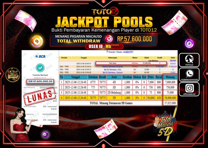 Selamat kepada Member Kami Mb****** Telah Jackpot dan berhasil mendapatkan kemenangan besar pada permainan JACKPOT POOLS PASARAN (MACAU 5D) Dengan Kemenangan Sebesar Rp.57.600.000 –.