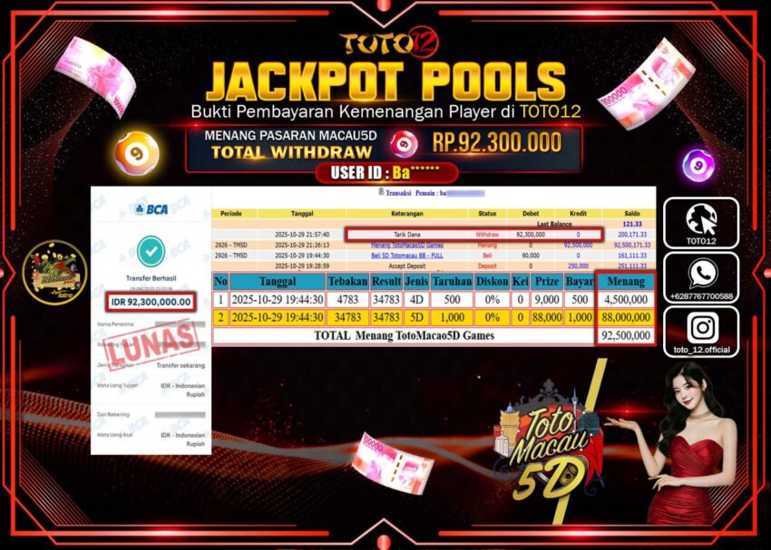 Selamat kepada Member Kami Ba****** Telah Jackpot dan berhasil mendapatkan kemenangan besar pada permainan JACKPOT POOLS PASARAN (MACAU 5D) Dengan Kemenangan Sebesar Rp.92.300.000 –. Setelah mengisi Fomulir Withdraw dengan Kurang waktu 1-2 Menit Dana sudah kami Trasnfer kepada Pemilik Userid dan dana sudah dapat di cairkan oleh pemenang. Bukti Pembayaran yang TOTO12 berikan merupakan Bukti Pembayaran yang SAH / VALID yang langsung Di dapatkan melalui transaksi dari Bank yang di Tunju.