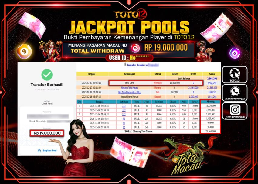 Selamat kepada Member Kami Ki****** Telah Jackpot dan berhasil mendapatkan kemenangan besar pada permainan JACKPOT POOLS PASARAN (MACAU4D) Dengan Kemenangan Sebesar Rp.19.000.000 –.
