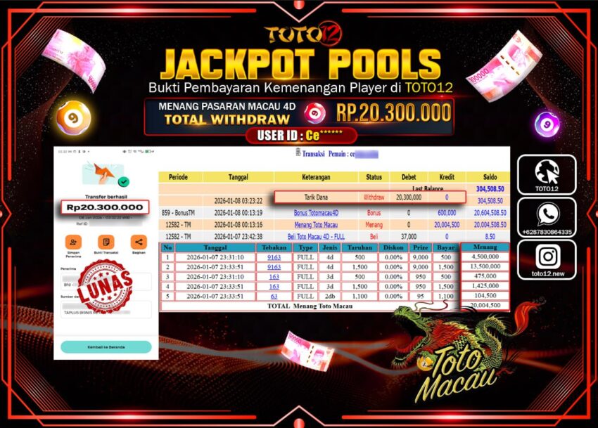 Selamat kepada Member Kami Ce****** Telah Jackpot dan berhasil mendapatkan kemenangan besar pada permainan JACKPOT POOLS PASARAN (MACAU4D) Dengan Kemenangan Sebesar Rp.20.300.000 –.