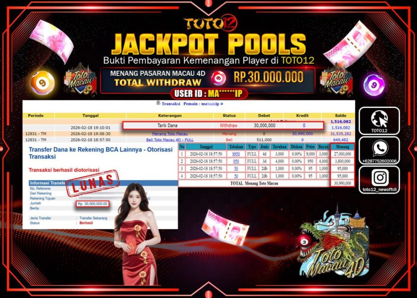 HANYA DI TOTO12 JP PASTI DI BAYAR LUNAS DAN CEPAT!!!!!! JACKPOT POOLS PASARAN (MACAU4D) Rp.30.000.000!!!!