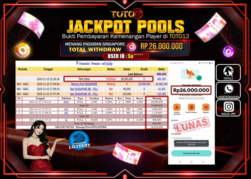 Selamat kepada Member Kami Su****** Telah Jackpot dan berhasil mendapatkan kemenangan besar pada permainan JACKPOT POOLS PASARAN (SINGAPORE)  Dengan Kemenangan Sebesar Rp.26.000.000 –.  Setelah mengisi Fomulir Withdraw dengan Kurang waktu 1-2 Menit Dana sudah kami Trasnfer kepada Pemilik Userid dan dana sudah dapat di cairkan oleh pemenang. Bukti Pembayaran yang TOTO12 berikan merupakan Bukti Pembayaran yang  SAH / VALID yang langsung Di dapatkan melalui transaksi dari Bank yang di Tunju.