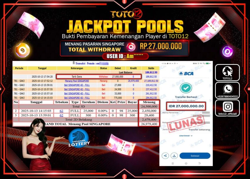 Selamat kepada Member Kami Am****** Telah Jackpot dan berhasil mendapatkan kemenangan besar pada permainan JACKPOT POOLS PASARAN (SINGAPORE) Dengan Kemenangan Sebesar Rp.27.000.000 –. Setelah mengisi Fomulir Withdraw dengan Kurang waktu 1-2 Menit Dana sudah kami Trasnfer kepada Pemilik Userid dan dana sudah dapat di cairkan oleh pemenang. Bukti Pembayaran yang TOTO12 berikan merupakan Bukti Pembayaran yang SAH / VALID yang langsung Di dapatkan melalui transaksi dari Bank yang di Tunju.
