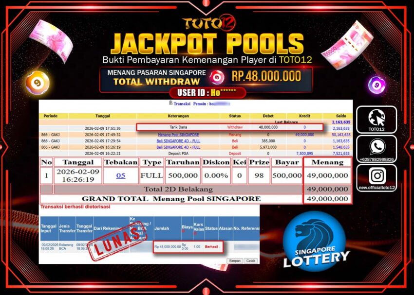 Selamat kepada Member Kami Ho***** Telah Jackpot dan berhasil mendapatkan kemenangan besar pada permainan JACKPOT POOLS PASARAN (SINGAPORE) Dengan Kemenangan Sebesar Rp.48.000.000–.