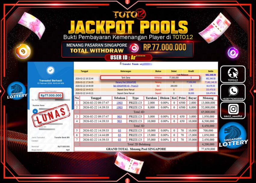 Selamat kepada Member Kami Ar****** Telah Jackpot dan berhasil mendapatkan kemenangan besar pada permainan JACKPOT POOLS PASARAN (SINGAPORE) Dengan Kemenangan Sebesar Rp.77.000.000–.