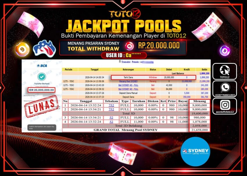 Selamat kepada Member Kami Ca****** Telah Jackpot dan berhasil mendapatkan kemenangan besar pada permainan JACKPOT POOLS PASARAN ( SYDNEY )  Dengan Kemenangan Sebesar Rp.20.000.000–.