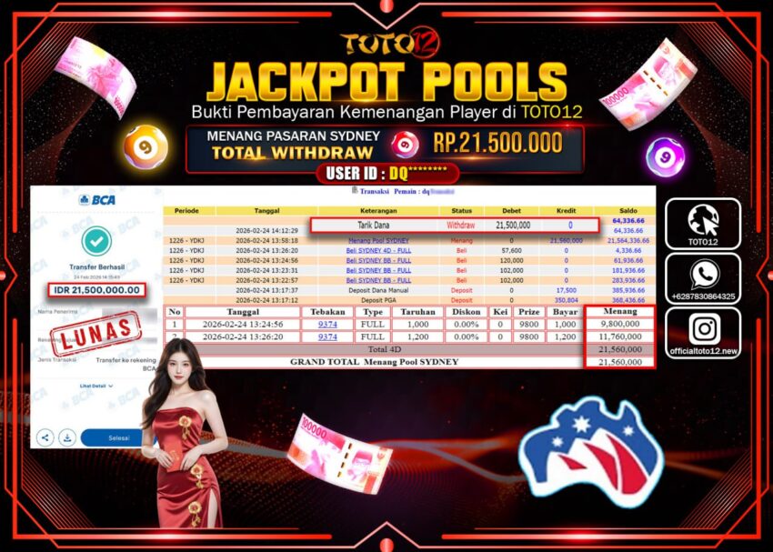 Selamat kepada Member Kami DQ****** Telah Jackpot dan berhasil mendapatkan kemenangan besar pada permainan JACKPOT POOLS PASARAN (SYDNEY) Dengan Kemenangan Sebesar Rp.21.500.000–.