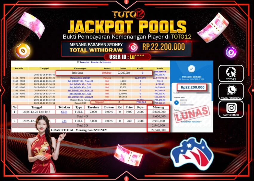 Selamat kepada Member Kami Lu****** Telah Jackpot dan berhasil mendapatkan kemenangan besar pada permainan JACKPOT POOLS PASARAN (SYDNEY) Dengan Kemenangan Sebesar Rp.22.200.000 –.