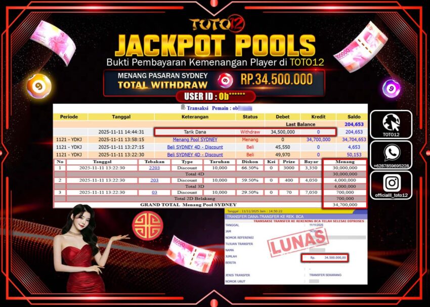 Selamat kepada Member Kami Ob****** Telah Jackpot dan berhasil mendapatkan kemenangan besar pada permainan JACKPOT POOLS PASARAN (SYDNEY) Dengan Kemenangan Sebesar Rp.34.500.000 –. Setelah mengisi Fomulir Withdraw dengan Kurang waktu 1-2 Menit Dana sudah kami Trasnfer kepada Pemilik Userid dan dana sudah dapat di cairkan oleh pemenang. Bukti Pembayaran yang TOTO12 berikan merupakan Bukti Pembayaran yang SAH / VALID yang langsung Di dapatkan melalui transaksi dari Bank yang di Tunju.
